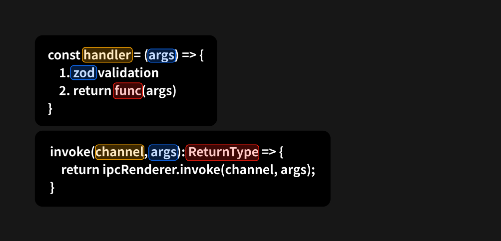 zod를 이용하여 타입을 검증하고, 인자의 타입을 추론하고, 이를 메인 프로세스 <-> 렌더러 프로세스간 통신에서 타입을 안전하게 다루도록 사용해봤습니다.