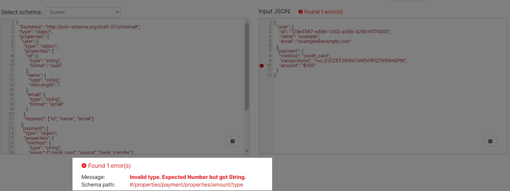 위 예시에서는 결제 데이터 중 amount 값의 타입을 숫자로 지정해두었는데요, JSON Schema 검증 도구에 amount를 숫자가 아닌 문자 ($100)을 넣으면 숫자가 아닌 문자가 들어왔다고 검증에 실패하게 됩니다.